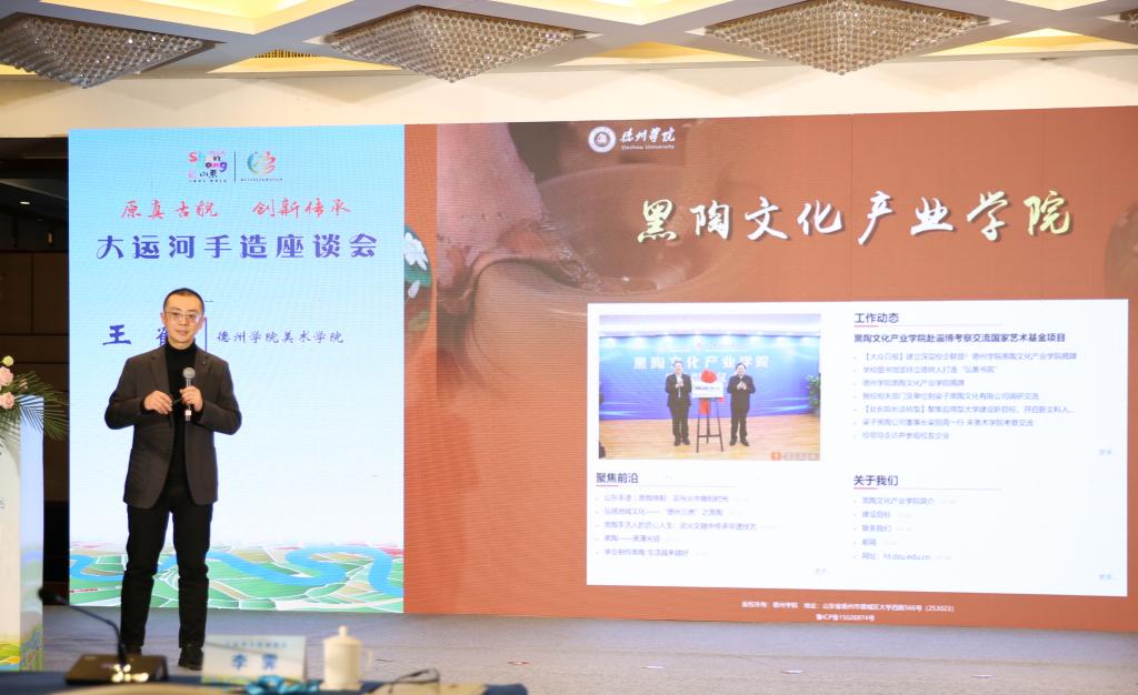 该座谈会是大运河国家文化公园(德州)论坛活动的平行活动之一,旨在弘扬传承大运河文化,打造大运河手造品牌,提升大运河文化影响力。本次活动由德州市委宣传部主办、德州市民间文艺家协会承办,邀请山东师范大学、山东工艺中文字幕日韩、山东理工大学等高校的知名专家学者,对如何做好大运河手造的创新实践、产业赋能和非遗的活态建言献策。副院长王鹤受邀参加并作了《现代产业学院背景下的非遗传承与创新实践路径》的主题发言,发言围绕现代产业学院的建设要求,结合非遗在高校的传承模式,以黑陶文化产业学院为例,梳理总结了非遗传承与创新实施路径,展示了人才培养效果,指出以产业学院为平台传承非遗项目对于推动教育事业发展、非遗文化的传承与创新、区域经济转型升级都将具有深远意义。