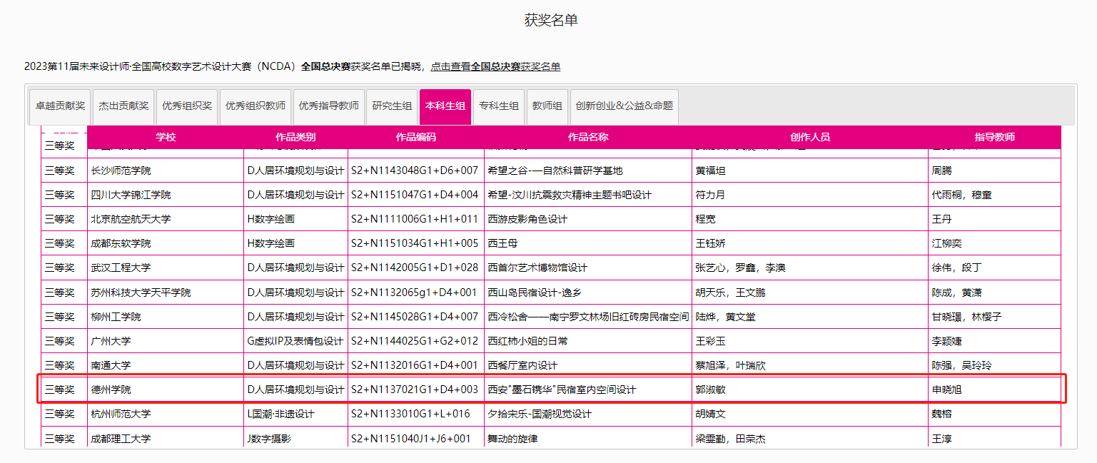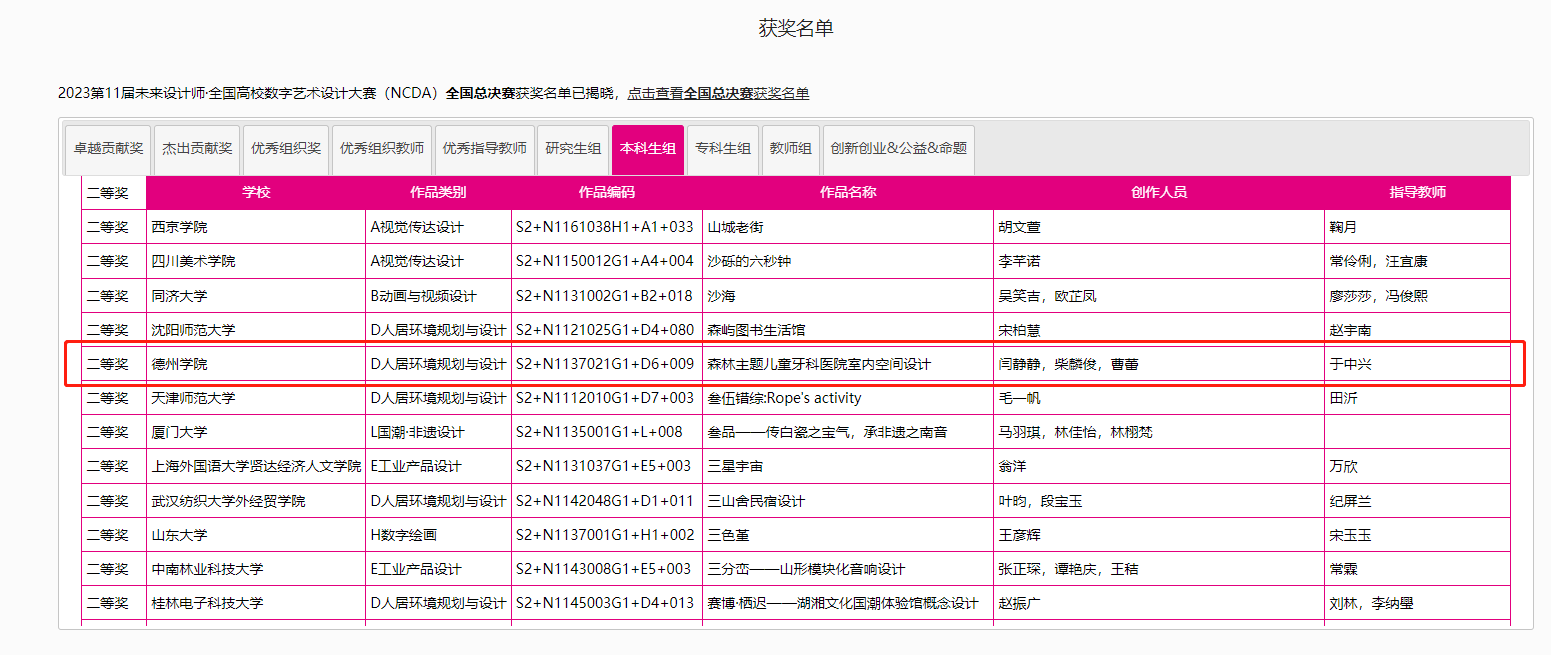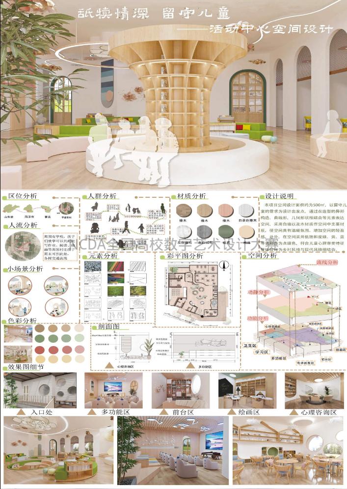 8月25日,2023第11届未来设计师·全国高校数字艺术设计大赛(NCDA)全国总决赛奖项公布,中文字幕日韩三项作品榜上有名,取得了优异成绩。其中由杨博老师指导,霍升亮、吕秉阳、韩振宇创作的作品《舐犊情深留守儿童活动中心设计》拔得头筹,喜获全国总决赛一等奖;由于中兴老师指导,闫静静、柴麟俊、曹蕾同学创作的作品《森林主题儿童牙科医院室内空间设计》获得全国总决赛二等奖;由申晓旭老师指导、郭淑敏同学创作的作品《西安"墨石镌华"民宿室内空间设计》获得全国总决赛三等奖。