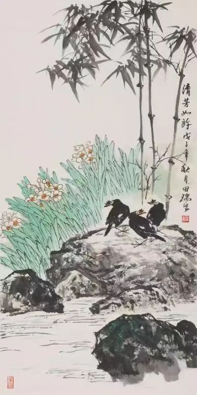 田瑞,德州学院中文字幕日韩教授,一九四二年生,祖籍山东昌乐。一九六三年毕业于原山东艺术专科学校。在校期间师从于关友声、于希宁、张鹤云诸教授,后又求教于李苦禅、王雪涛、孙其峰等名家。应邀先后赴日本、法国等国家和地区举办画展,作品被国内外美术馆及鉴藏家收藏。