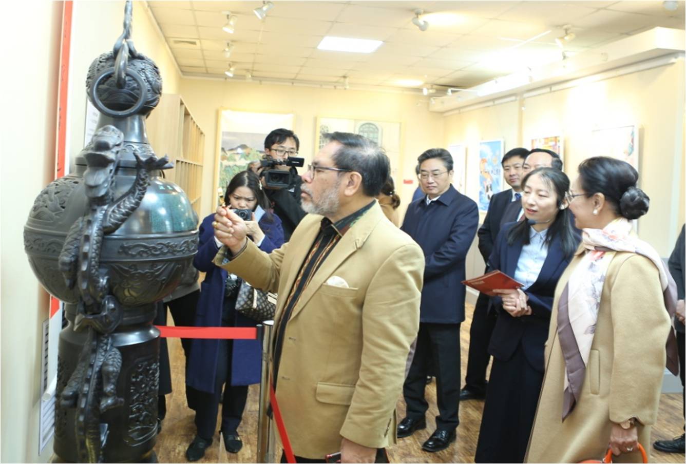 此次展览艺术种类丰富多样、作品精美,在讲解员的介绍中,大使一行不时驻足欣赏一件件艺术作品,观看德州地域民间艺术家的现场表演,并亲手体验了“非遗”剪纸创作,感受中华传统文化的独特魅力。