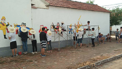 在理合务镇东宫村,青年志愿者绘制了“礼敬中华”系列文化墙绘,包括“闻鸡起舞”、“程门立雪”、“岳母刺字”、“孔融让梨”、“铁杵成针”、“卧冰求鲤”等系列文化故事和“尊老、爱幼、明礼、守法”文化宣传等内容。