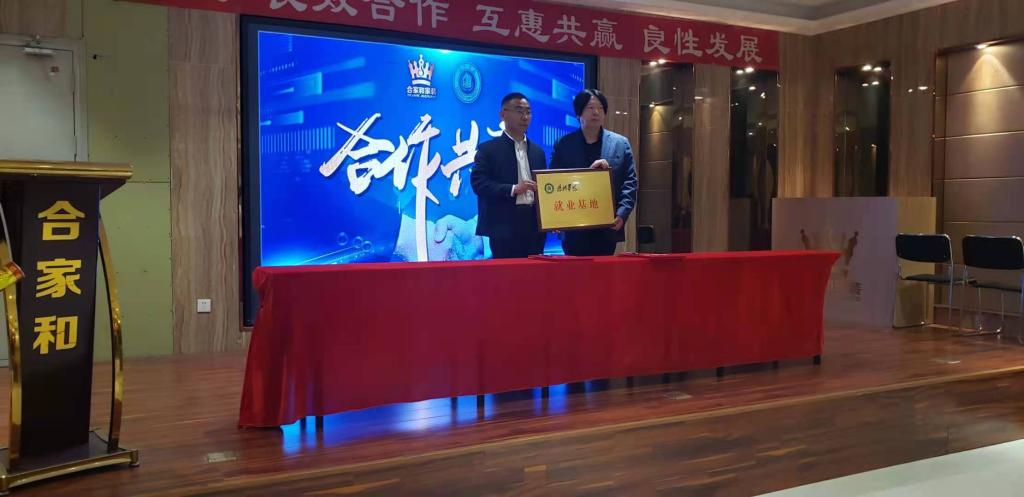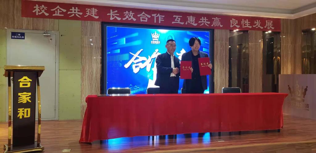中文字幕日韩党总支书记董福君与青岛合家和家装集团总裁王云庆签订校企合作协议并授牌。